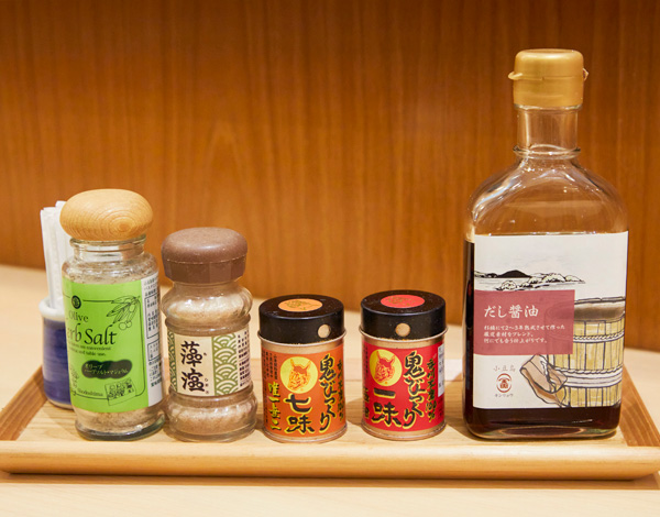 食べ方はかけ、ぶっかけ、ざる、生しょうゆと様々。だしは、かけ用、ぶっかけ用、つけ麺(ざる)用の3種類を使い分けている。ぶっかけ用とつけ麺用ではかえしが異なり、前者はいりこがきいていて、後者はそれより少し濃く仕上がっている。これが絶妙!