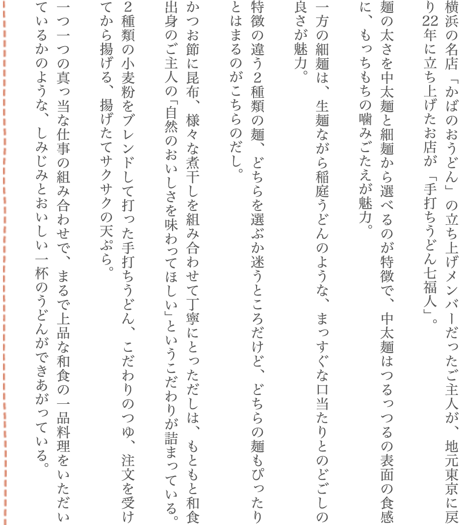 横浜の名店「かばのおうどん」の立ち上げメンバーだったご主人が、地元東京に戻り22年に立ち上げたお店が「手打ちうどん七福人」。