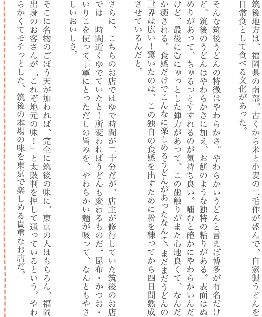 そこに名物のごぼう天が加われば、完全に筑後の味に。東京の人はもちろん、福岡出身のお客さんが「これぞ地元の味!」と太鼓判を押して通っているという。やわらかくてモチっとした、筑後の本場の味を東京で楽しめる貴重なお店だ。