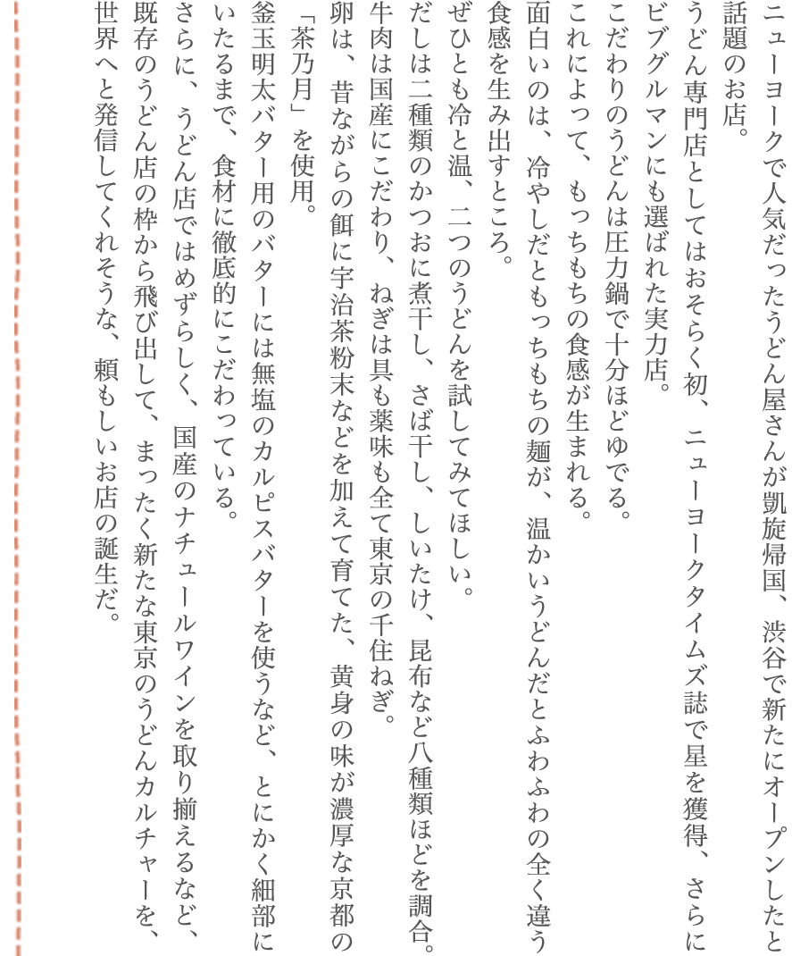 ニューヨークで人気だったうどん屋さんが凱旋帰国、渋谷で新たにオープンしたと話題のお店。