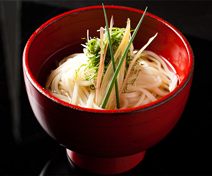 「糸うどん」ともいわれ、加賀藩前田候の御用達うどんとして献上されていました。その作り方はそうめんとほぼ同じですが、油を使わないのが「氷見うどん」独自の製法であり、これにより強いコシとつや、そしてのど越しの良さと歯応えが生まれます。