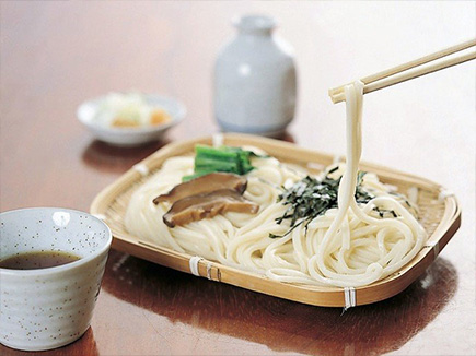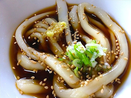 あっさり味の冷たいつゆに、水洗いした冷たいうどんを潜らせて食べる、というのが一般的です。しかし食べ方に特に制約はないので、冷たいごま味噌風味のつゆにつけて食べる「冷汁うどん」、長ねぎと油揚げを甘辛く煮て加える「ねぎ南蛮うどん」、油で炒めたなすとねぎが入った温かいつゆにつけて食べる「なす南蛮うどん」など、工夫次第でさまざまな味わいを楽しむことができます。