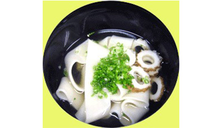 「しのうどん」は、幅は約2cmと広く、長さはなんと約1m!コシは弱くやわらかいものの食べ応えのあるうどんです。椀の中に1本のうどんが円を描くように盛り付けられ、「心ま~るく、ま~るく」と唱えながら食べていたといわれています。